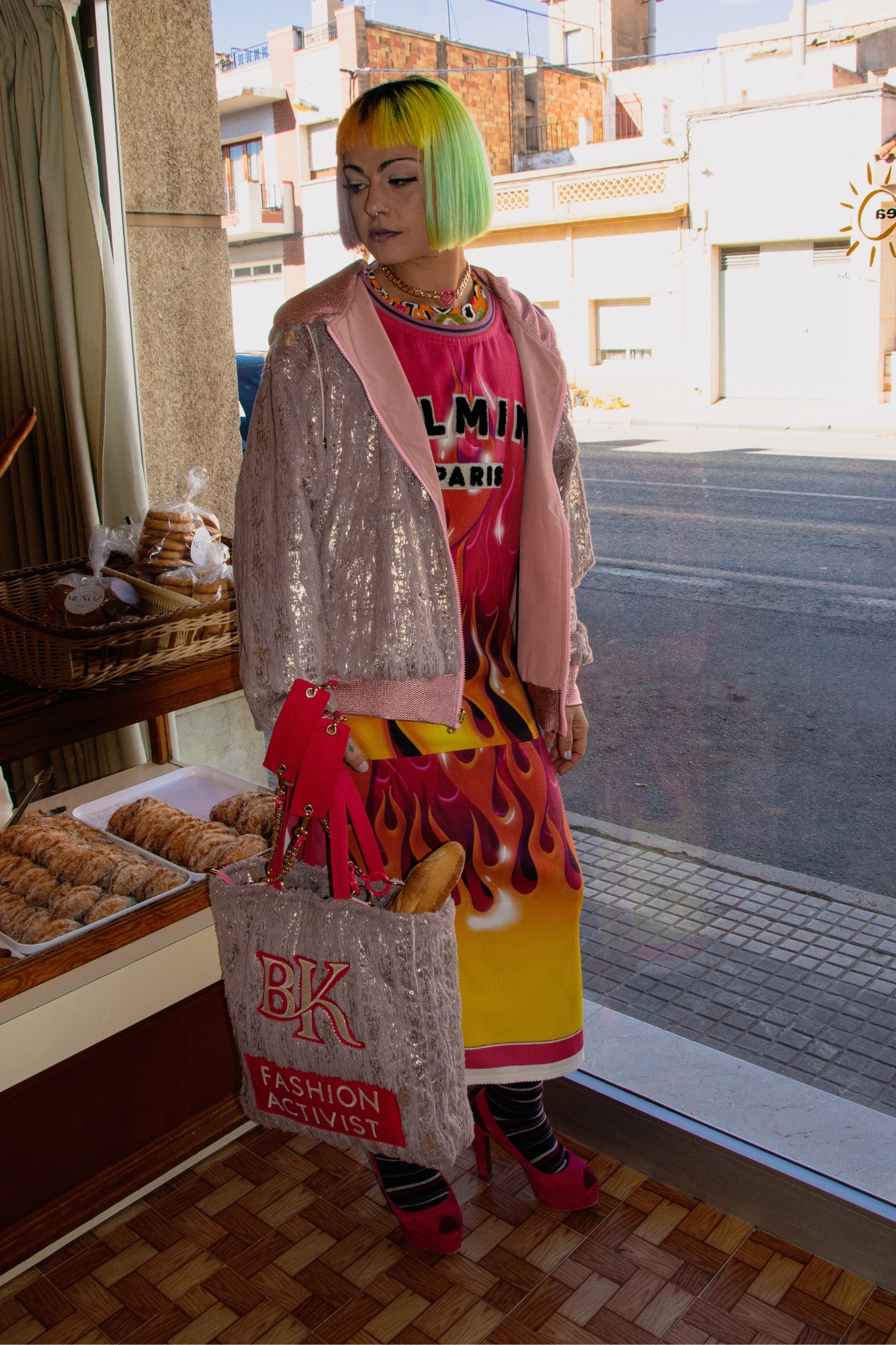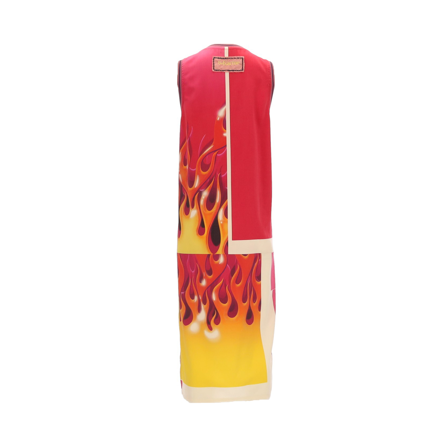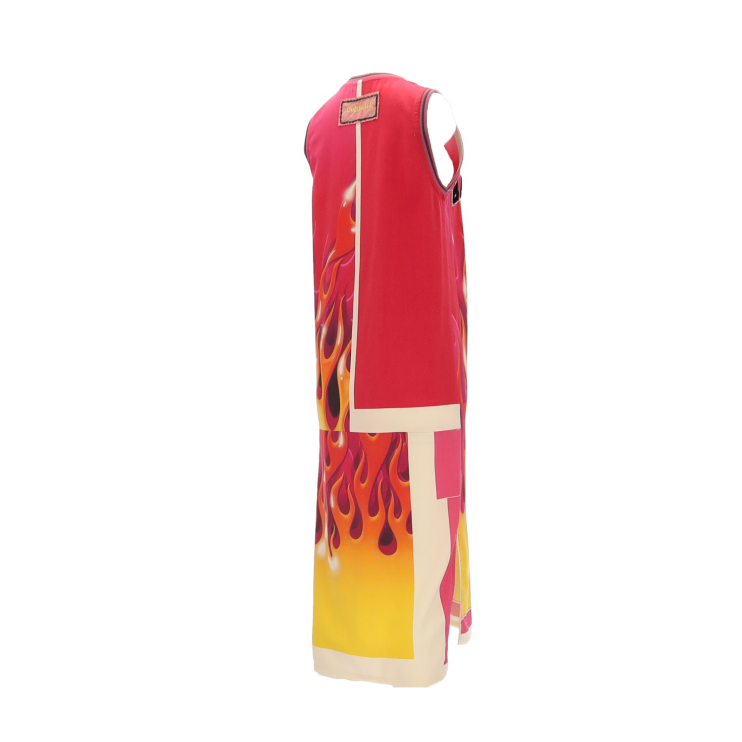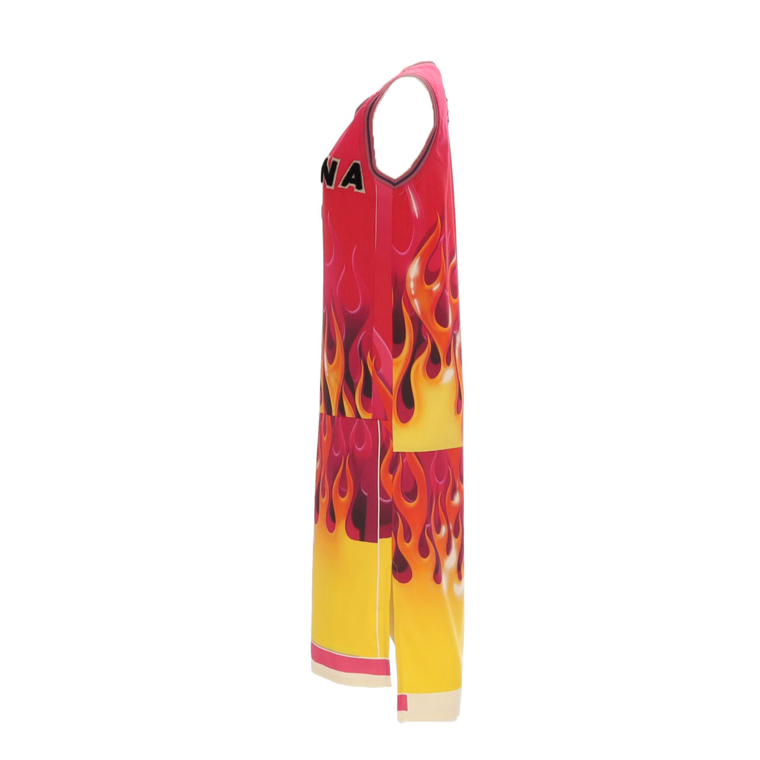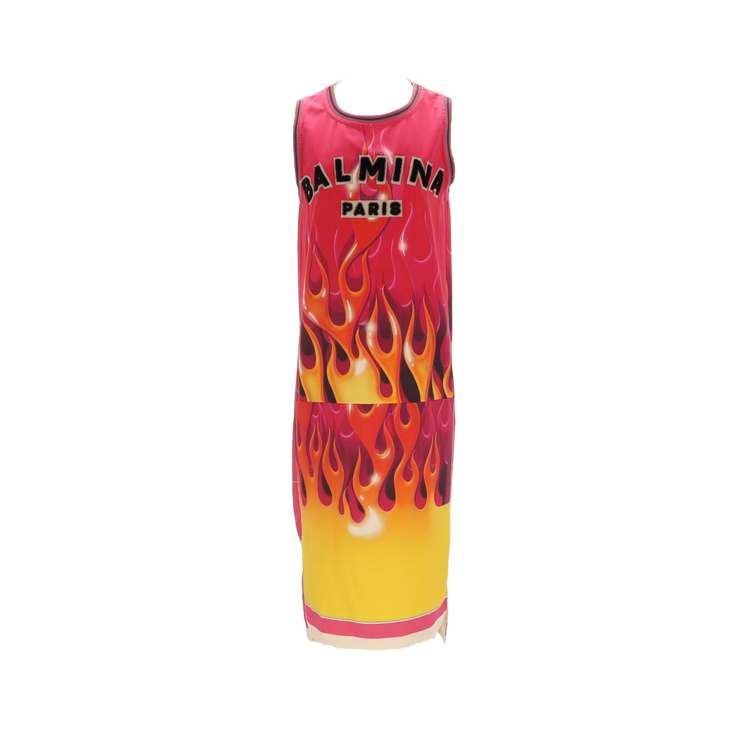 Vestido largo midi tipo camiseta de basket. Cuello y mangas en canalé. Print efecto fuego, el rosa es el predominante, con 4 capas en amarillo, naranja, fucsia y negro. Reinterpretación de letras de la casa Balmain Paris.