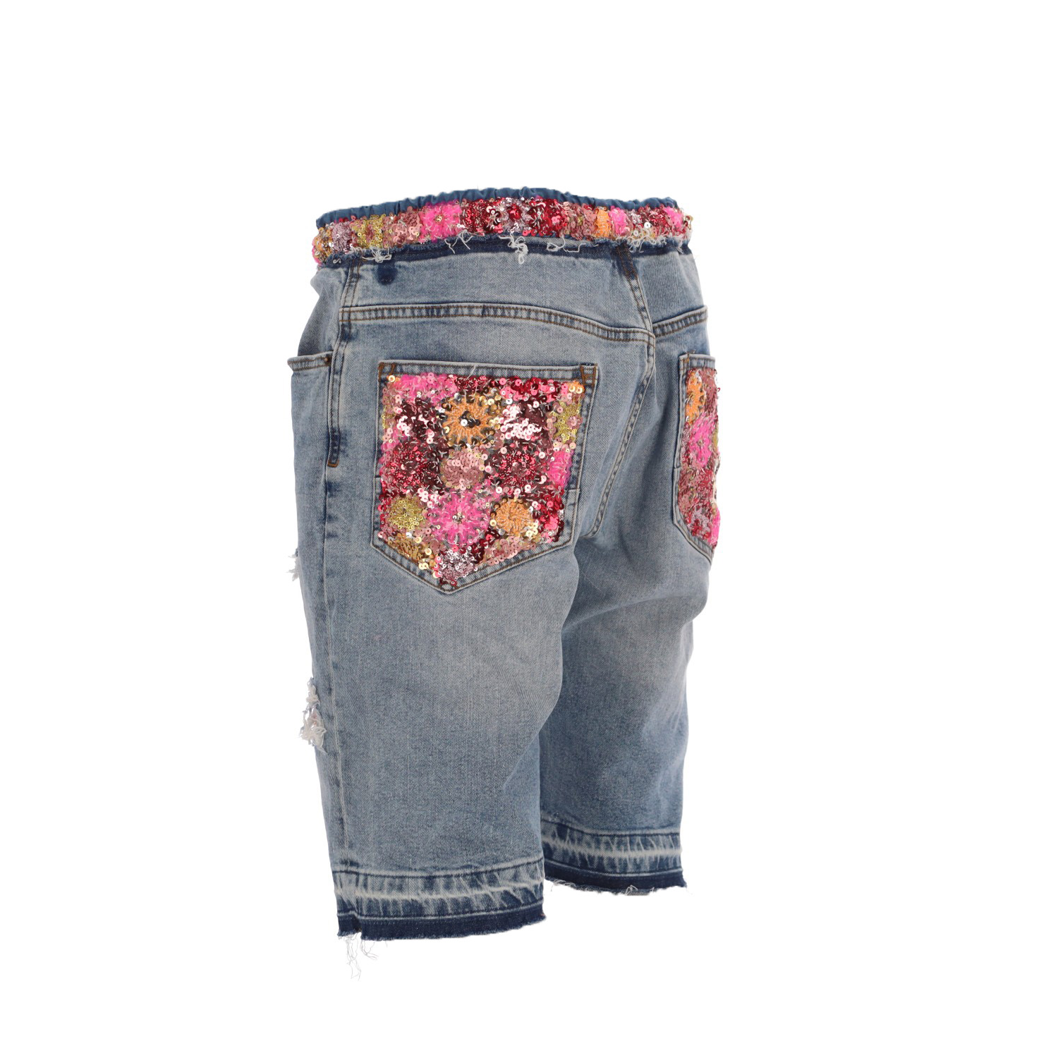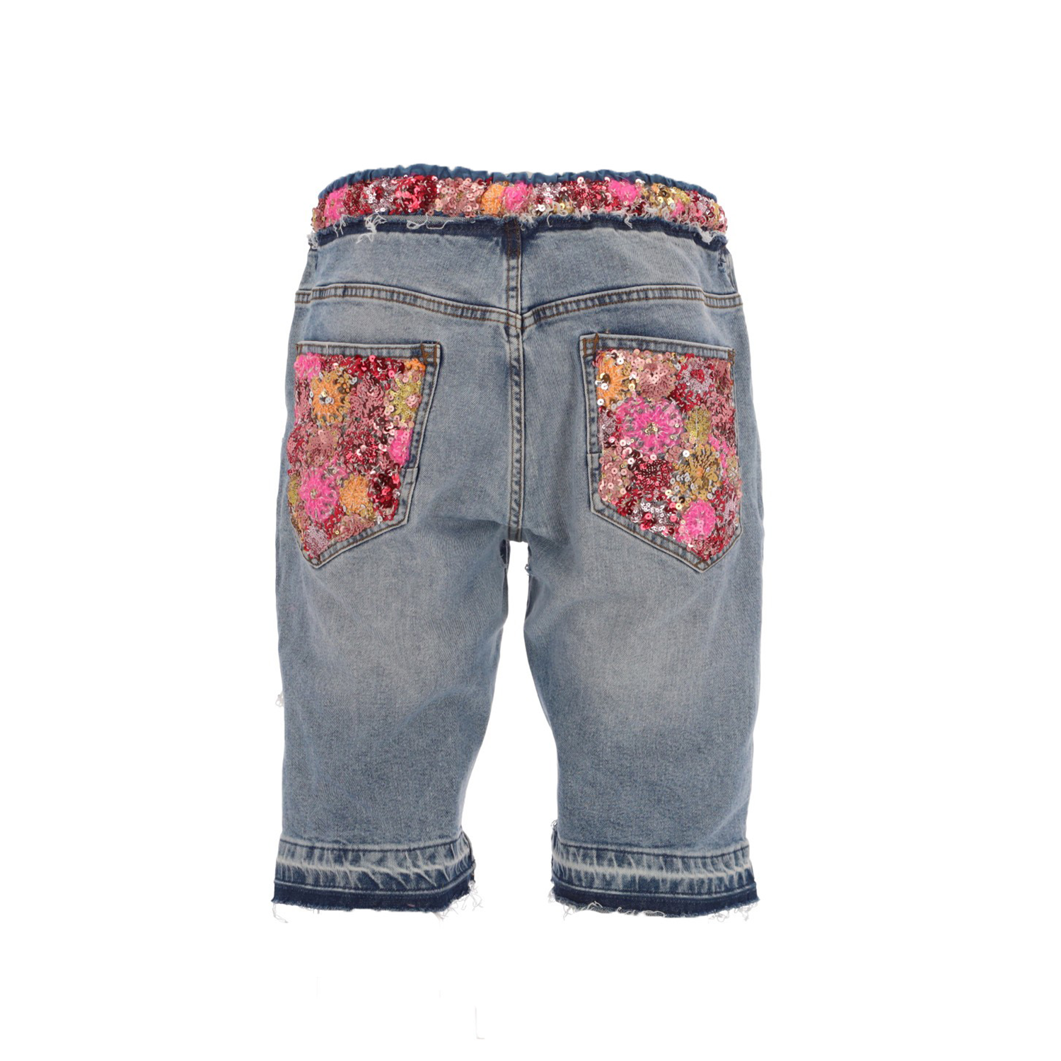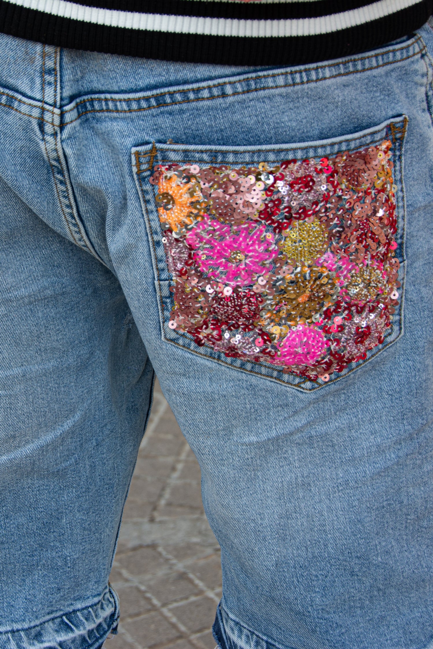 Jeans Largo corsario combinado con tejido de lentejuelas en agujeros y bolsillos traseros.