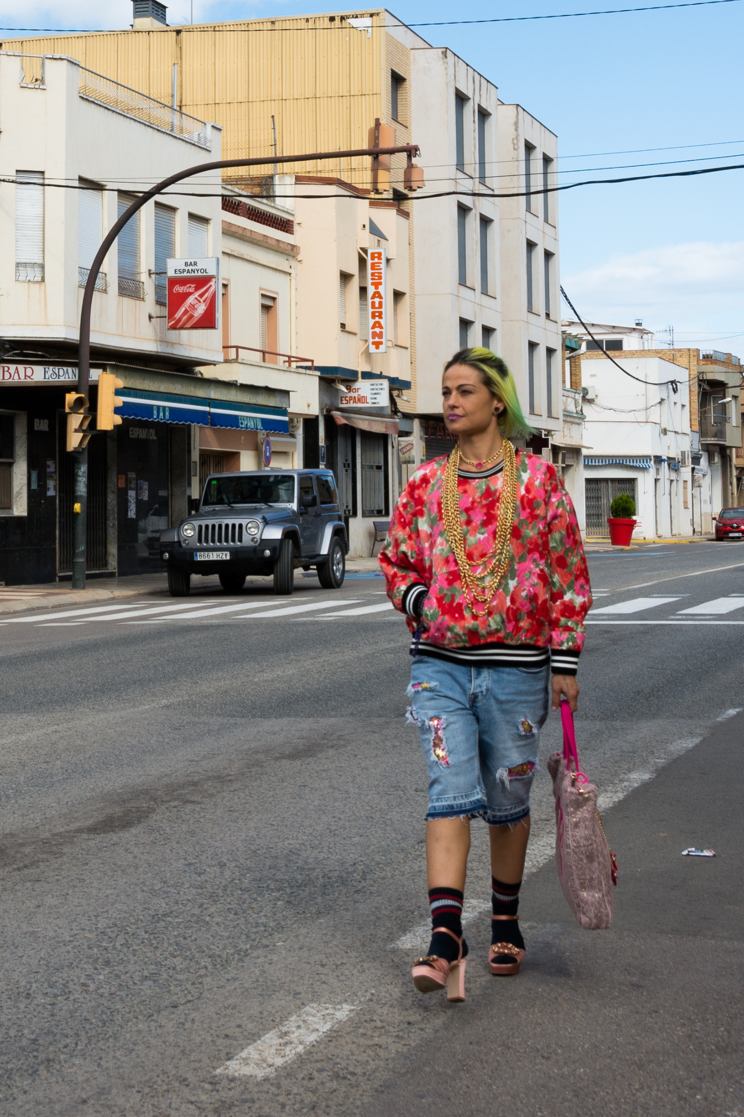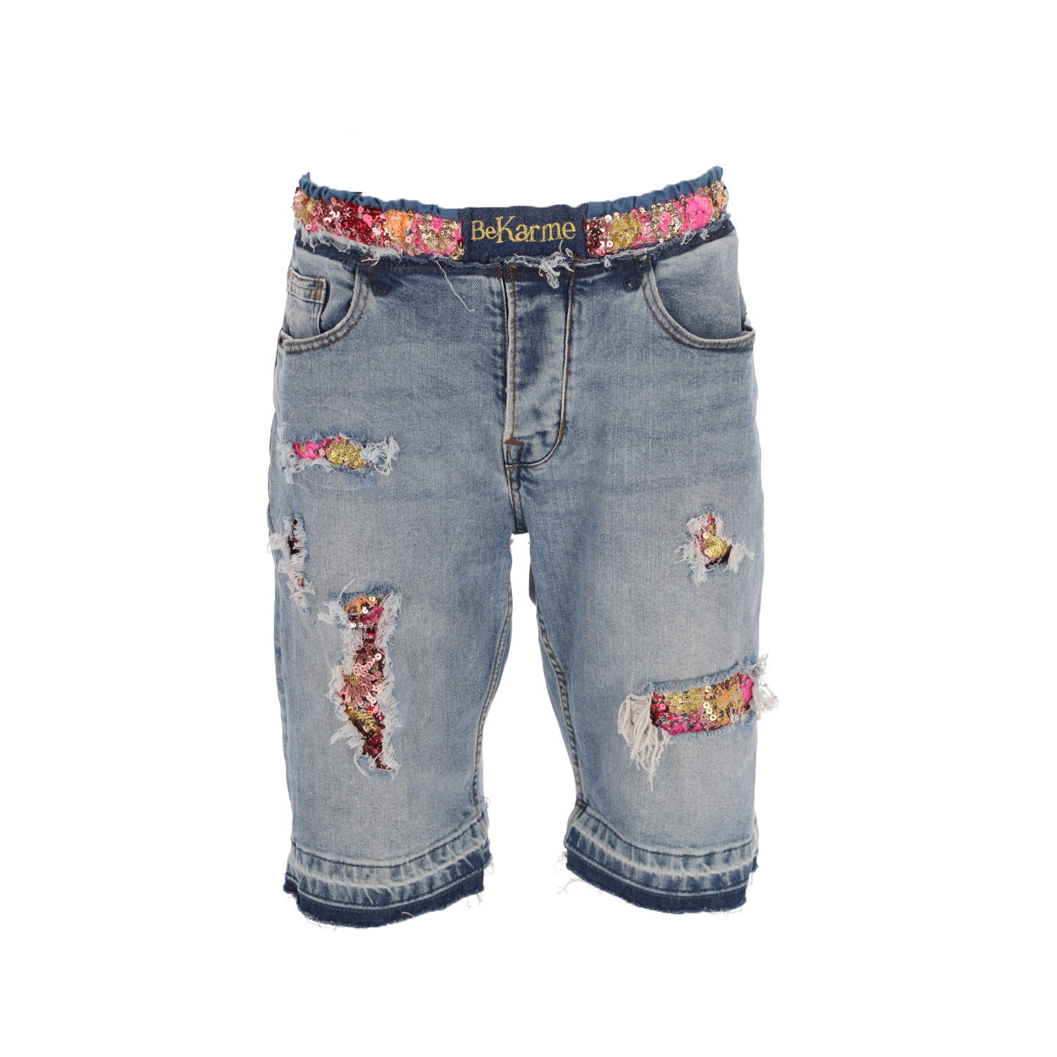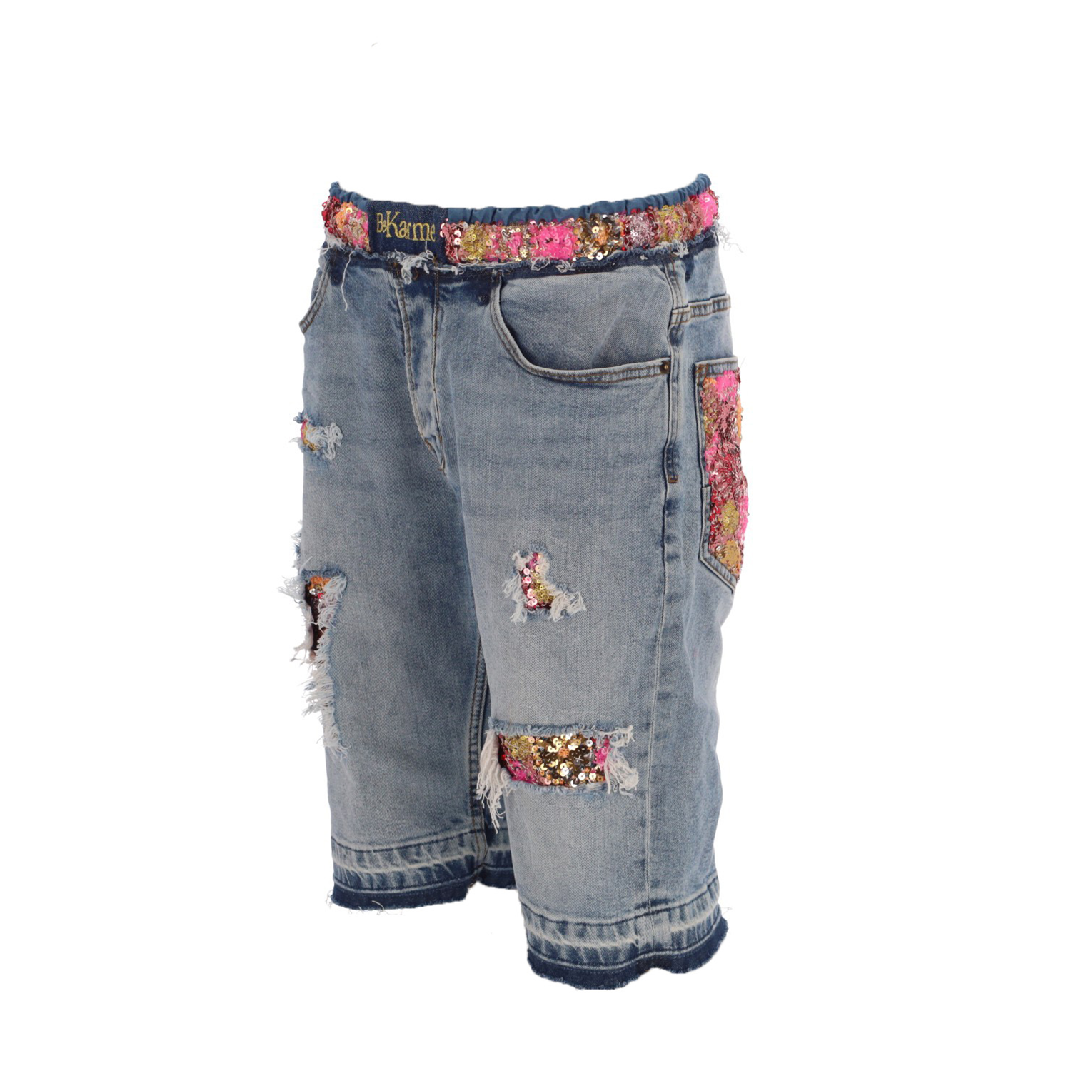 Jeans Largo corsario combinado con tejido de lentejuelas en agujeros y bolsillos traseros.