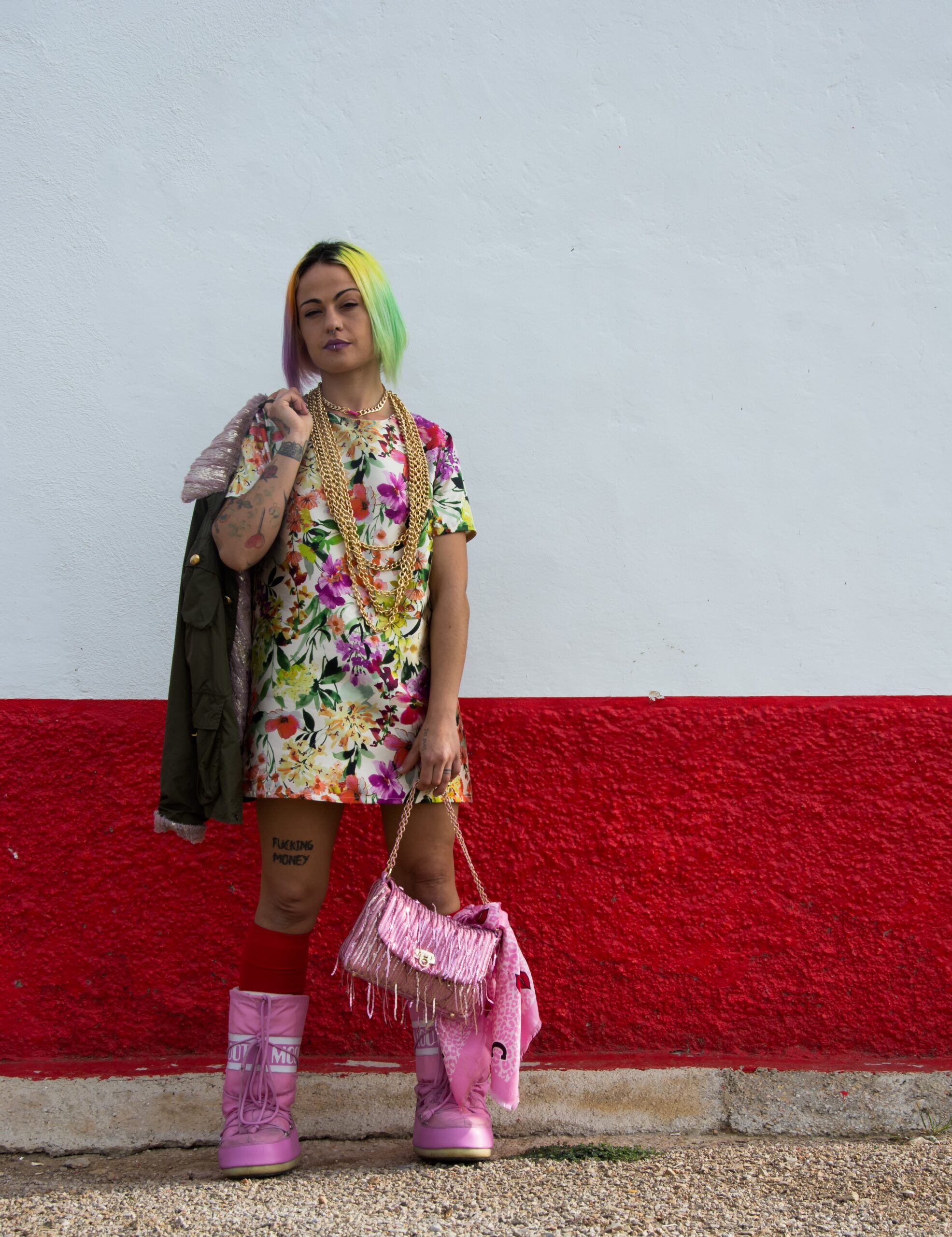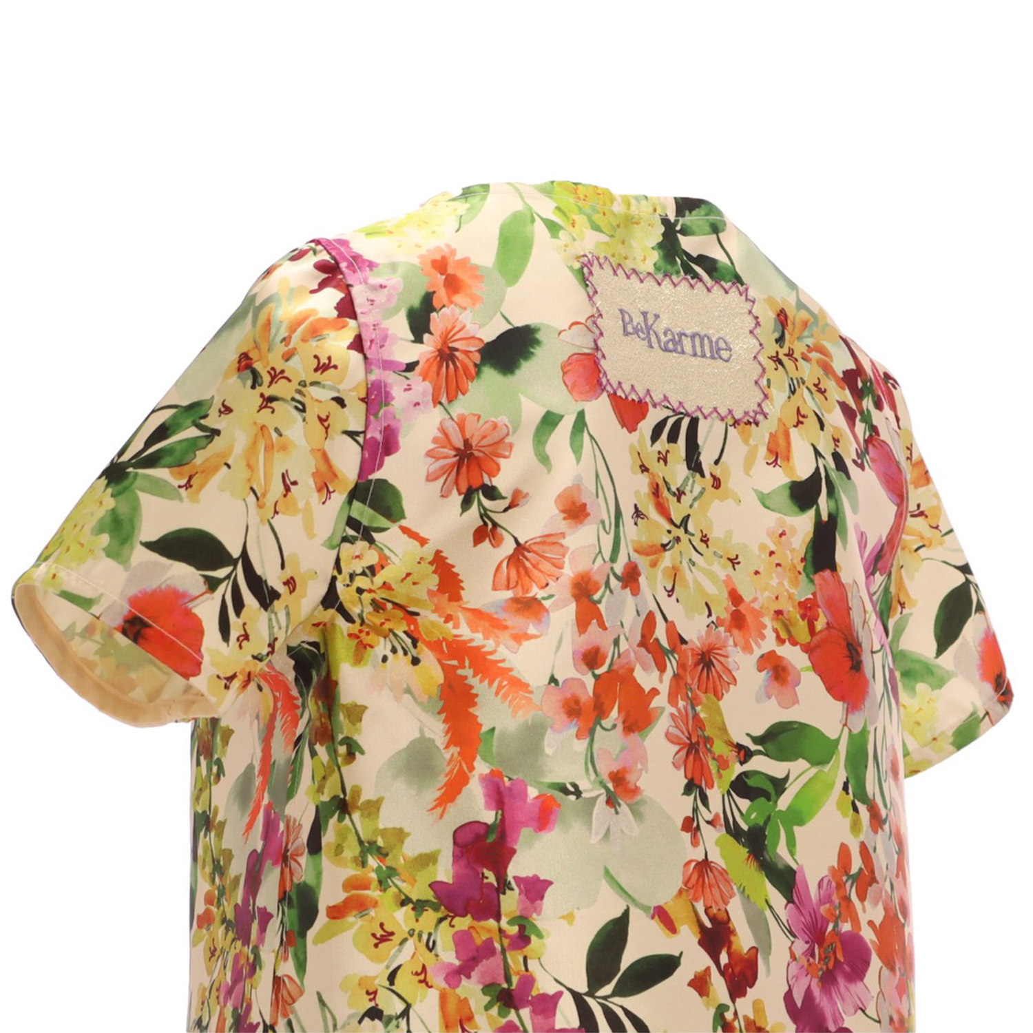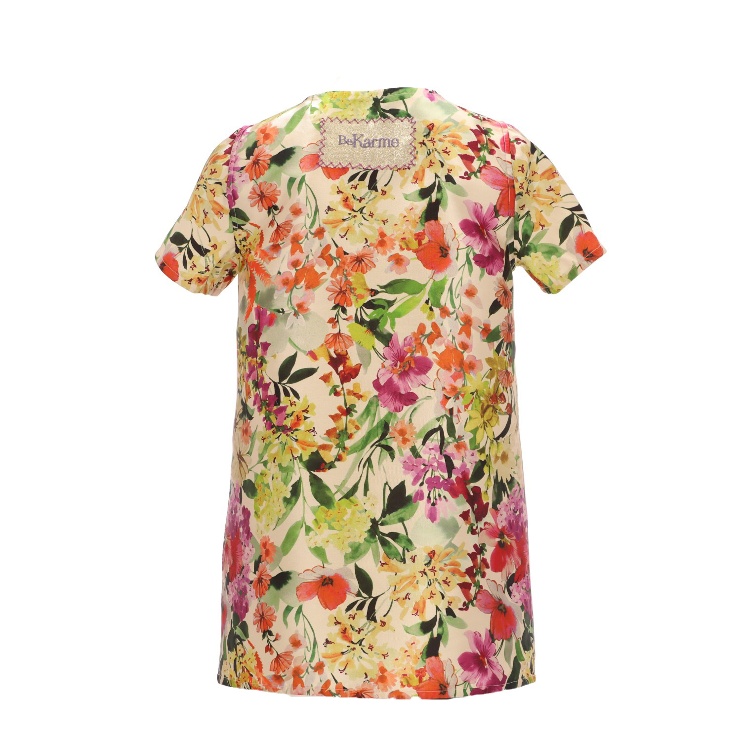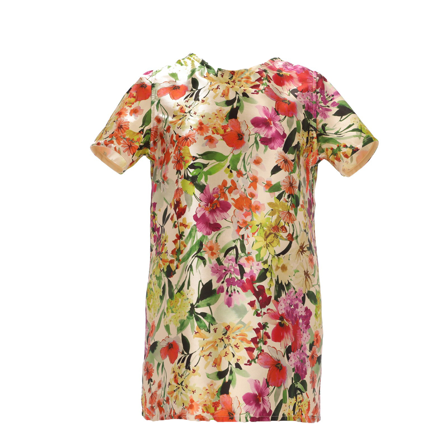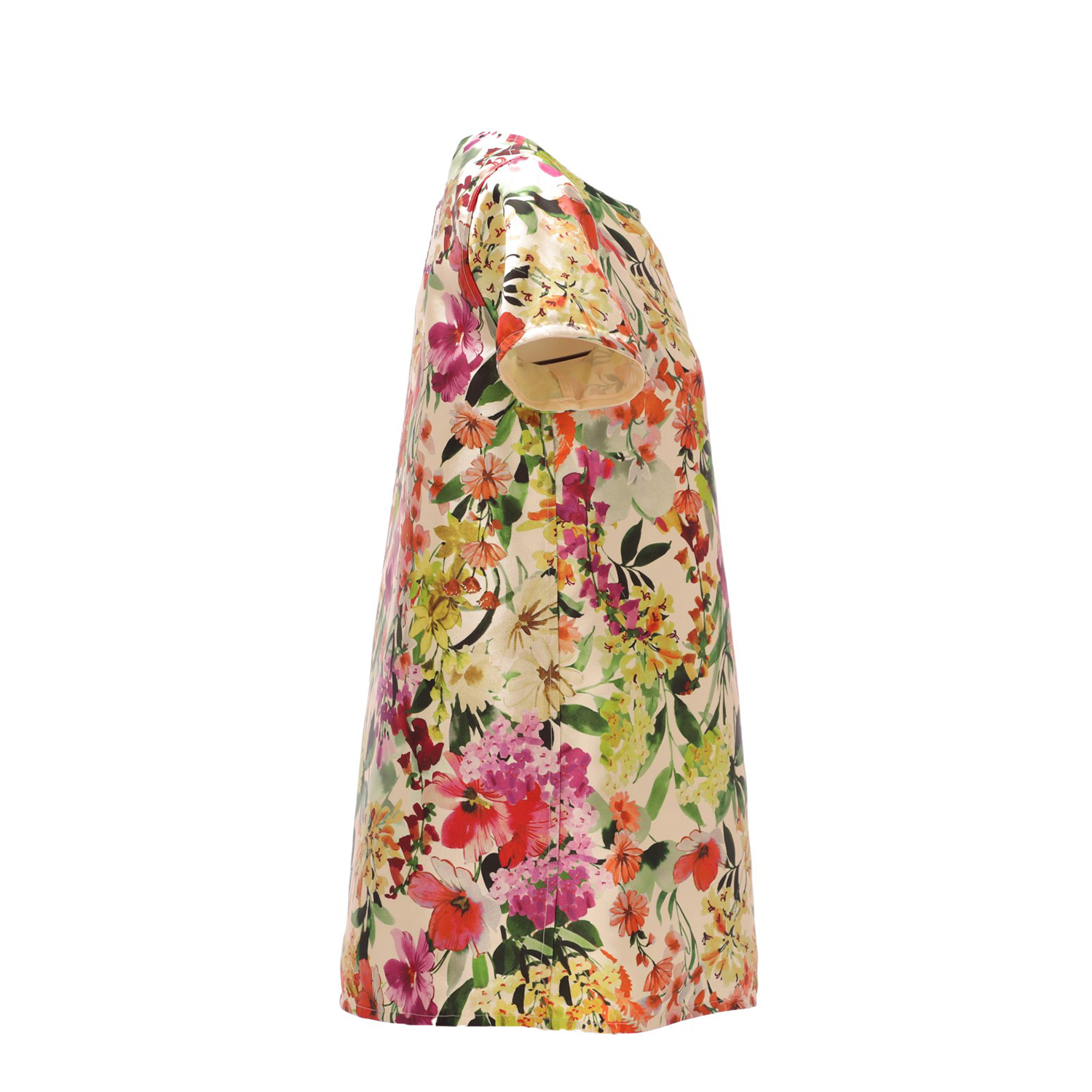 Vestido mini estilo 60’s, con print floral, cuello redondo y manga corta montada. Tejido efecto satinado iconografía botánica.